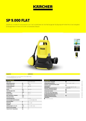 Die flachabsaugende Tauchpumpe SP 9.000 Flat hilft zuverlässig beim Abpumpen von klarem oder leicht verschmutztem Wasser mit bis zu 5 Millimeter großen Schmutzpartikeln. Mit bis zu 9.000 l/h eignet sie sich ideal zum Entwässern kleinerer Pools oder von durch Grundwassereintritt oder Waschmaschinen-Leckagen überschwemmten Kellern. Eine robuste Gleitringdichtung macht die Pumpe extra langlebig. Optional ist eine Garantieverlängerung auf 5 Jahre möglich. Ein Schwimmerschalter schaltet die Pumpe je nach Wasserstand ein und aus und verhindert so auch ein Trockenlaufen. Und dank der Fixierungsmöglichkeit für den Schwimmer kann sie auch bei niedrigem Wasserstand im Dauerbetrieb verwendet werden. Die SP 9.000 Flat verfügt außerdem über klappbare Standfüße, durch deren Ausklappen eine höhere Förderleistung erreicht wird. Beim Einklappen der Füße startet die Klarwasser-Tauchpumpe schon bei einem Wasserstand von 7 Millimetern und pumpt im Dauerbetrieb sogar bis auf 1 Millimeter wischtrocken ab. Und per Quick Connect-Anschlussstutzen lassen sich 1″-, 1 1/4″- und 1 1/2″-Schläuche schnell und einfach anschließen.