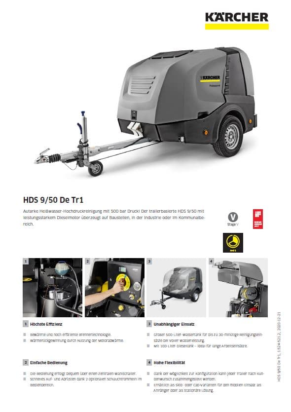 Der HDS 9/50 erzeugt 500 Bar Druck, zählt zur Geräteklasse der trailerbasierten Heißwasser-Hochdruckreiniger und bietet ein Höchstmaß an Mobilität. Dank starkem Dieselmotor ist das Gerät vollkommen unabhängig von Stromquellen an allen erdenklichen Orten.