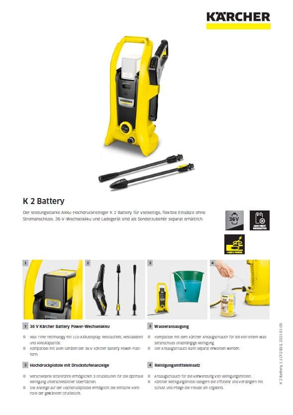 Glänzt auch ohne Stromanschluss: der akkubetriebene Hochdruckreiniger für vielseitige Anwendungsgebiete wie kleinere Autos, Boote, Gartenmöbel, Mülltonnen und weitere kleinere Reinigungsaufgaben rund ums Haus. Dank Standard-, Boost- und Reinigungsmittel-Modus lassen sich die verschiedenen Reinigungsobjekte mit genau dem richtigen Druck bearbeiten. Auf dem analogen Display der Hochdruckpistole wird der gewählte Modus während der Reinigung dauerhaft angezeigt. Die einzelnen Druckstufen können bequem durch den Wechsel des Strahlrohrs eingestellt werden. Das Gerät ist kompatibel mit dem 36 V / 5,0 Ah Li-Ion Wechselakku aus der 36 V Kärcher Battery Power-Plattform. Akku und Ladegerät sind als Sonderzubehör separat erhältlich. Zudem kann ein Kärcher Ansaugschlauch angeschlossen werden, um Wasser aus alternativen Wasserquellen anzusaugen.