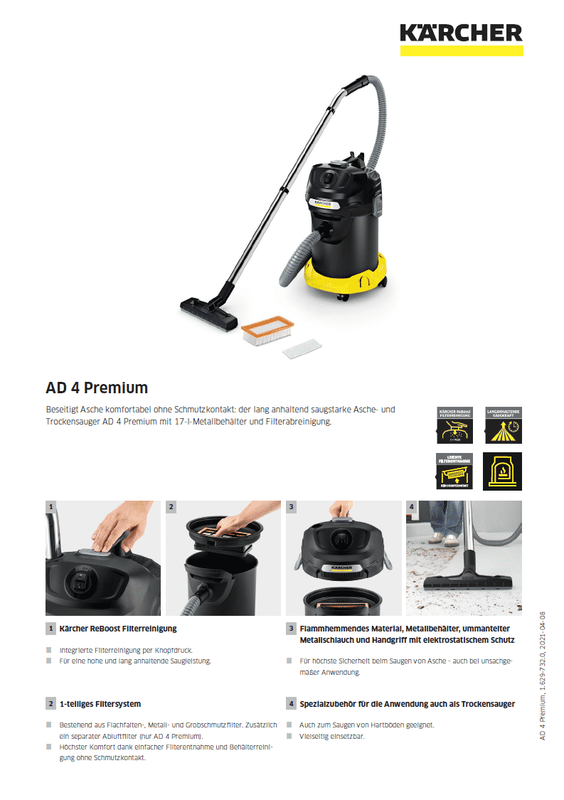 Der Asche- und Trockensauger AD 4 Premium mit einer 600-Watt-Turbine und einem Abluftfilter besticht durch hohe und lang anhaltende Saugkraft. Sein integriertes Filterabreinigungssystem reinigt den zugesetzten Filter per Knopfdruck, sodass die Saugkraft blitzschnell wieder erhöht ist. Für die schnelle und bequeme Entleerung des Schmutzbehälters ganz ohne Schmutzkontakt sorgen ein 1-teiliges Filtersystem (mit robustem Flachfaltenfilter und Metall-Grobschmutzfilter) sowie ein praktischer Handgriff am Behälter. Darüber hinaus bieten hochwertige, flammenhemmende Materialien maximale Sicherheit bei der Aufnahme von Asche. Und dank des abgeschrägten Handrohres werden Ascherückstände komfortabel restlos aufgesaugt – auch in Ecken und an schwer erreichbaren Stellen im Kamin. Zusammen mit der im Lieferumfang enthaltenen Bodendüse für die Hartflächenreinigung und den hochwertig verchromten Saugrohren ist der AD 4 Premium als vollwertiger Trockensauger überall einsetzbar.Ebenfalls praktisch: die Zubehöraufbewahrung für das Kabel sowie die bei Arbeitsunterbrechungen hilfreiche Anlehnposition für den Saugschlauch oder Saugrohre mit Bodendüse.