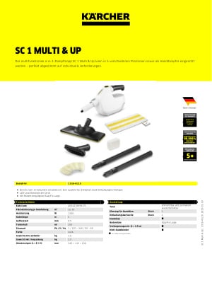 Der kompakte 4-in-1-Dampfmopp SC 1 Multi & Up reinigt ohne Chemie und ist blitzschnell für die porentiefe Reinigung im Haushalt zwischendurch einsetzbar, entweder als multifunktionaler Handdampfer oder dank des enthaltenen Bodendüsensets EasyFix Large als wandlungsfähiger 3-in-1-Dampfmopp. Das Arbeiten in 3 verschiedenen Gerätepositionen oben, in der Mitte und unten ist perfekt auf individuelle Anforderungen abgestimmt. Bei gründlicher Reinigung mit dem Kärcher Dampfreiniger werden bis zu 99,999 % der Viren* und 99,99 % aller haushaltsüblichen Bakterien** auf Hartflächen beseitigt. Das kompakte und handliche Gerätedesign ermöglicht ein Handling, ohne zu ermüden, und das Verstauen auf kleinstem Raum. Der SC 1 Multi & Up ist in 30 Sekunden einsatzbereit und kann dank des entnehmbaren Wassertanks einfach befüllt werden – ohne lange Wartezeit und Arbeitsunterbrechung. Die auswechselbare Entkalkungskartusche sorgt für eine automatische Entkalkung und so für eine 5-mal längere Lebensdauer. Die LED-Leuchtanzeige mit Bedienfeld ermöglicht eine einfache und mühelose Bedienung. Die verschiedenen Modi wie Aufheizen, Ready-to-use, Dampfbetrieb und Kartuschenwechsel werden stets angezeigt.