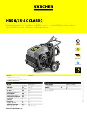 Erstklassiges Preis-Leistungs-Verhältnis: der 1-phasige Heißwasser-Hochdruckreiniger der Kompaktklasse HDS 6/15-4 C Classic mit kraftvollem 4-poligen Motor. Eine leistungsstarke Kurbelwellenpumpe baut den nötigen Druck auf und ermöglicht es, eine große Bandbreite an Reinigungsaufgaben effizient und schnell mit der bewährten Classic-Hochdruckpistole zu erledigen. Druck und Wasserdurchfluss können je nach Anforderung angepasst werden. Der integrierte Wasserfilter hält Schmutzpartikel von der Pumpe fern und verlängert die Standzeit. Die Heißwassertechnik bricht selbst Schmierstoffe effektiv auf und reduziert den Reinigungsmitteleinsatz. Der hochzuverlässige und wartungsfreundliche HDS 6/15-4 C Classic ist konzipiert für den täglichen Einsatz unter harten Bedingungen – ob auf Baustellen, in der Landwirtschaft, der Automotive- oder der Transportbranche. Ein robuster Stahlrohrrahmen sorgt für Schutz vor Stößen, pannensichere Räder für hohe Mobilität. Durch einen Anschlagpunkt ist das Gerät auch per Kran verladbar. Der 30-Liter-Kraftstofftank ermöglicht sehr lange Einsätze. Für mitgeführtes Zubehör gibt es ein praktisches Aufbewahrungsfach.