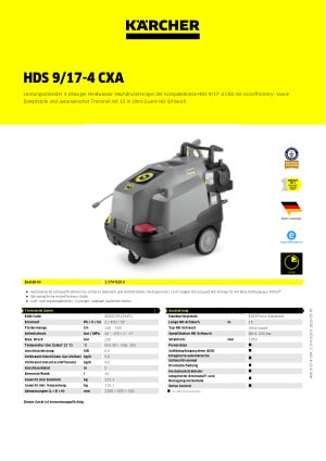 Der leistungsstärkste 3-phasige Heißwasser-Hochdruckreiniger der Kompaktklasse inklusive automatischer Schlauchtrommel: der HDS 9/17-4 CXA mit eco!efficiency– sowie Dampfstufe. Sein kraftvoller 4-poliger Motor ist wassergekühlt. Eine robuste Axialpumpe mit 3 Keramikkolben baut großen Druck auf. Die automatische Trommel zum Auf- und Abrollen des 15 Meter langen Ultra Guard-HD-Schlauchs mit Beschichtung aus Teflon® sorgt auch unter Druck für Flexibilität und kurze Rüstzeiten. Die EASY!Force Advanced-Hochdruckpistole mit Servo-Control-Regler zum Anpassen von Druck und Wasserdurchfluss, patentierter Düsentechnologie sowie EASY!Lock-Schnellverschlüssen macht die Arbeit ergonomisch. Das Softdämpfungssystem SDS mindert Schwingungen. Die Heißwassertechnik bricht selbst Schmierstoffe effektiv auf und reduziert den Einsatz von Reinigungsmitteln, die aus einem 15,5-Liter-Tank präzise dosiert werden. Der wartungsfreundliche HDS 9/17-4 CXA ist konzipiert für den täglichen Einsatz unter harten Bedingungen. Die Möglichkeit zur Entkalkung, ein Wasserfilter und ein Sicherheitsventil schonen die Technik. Ein robustes Chassis schützt vor Stößen, große Räder und eine Lenkrolle bieten hohe Mobilität.