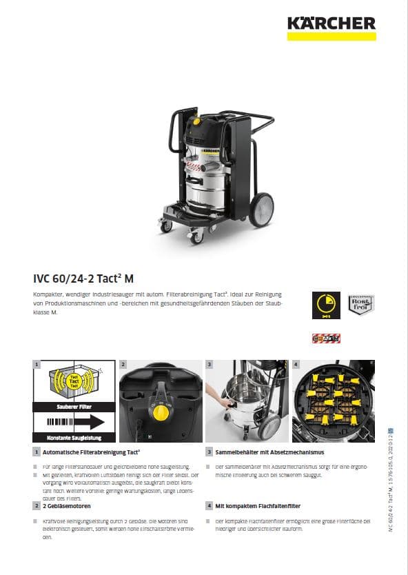 Der IVC 60/24-2 Tact² M ist ein kompakter Industriesauger mit großen Rädern und Bremsrollen. Das ausgesprochen wendige Gerät eignet sich optimal zur Reinigung von Produktionsmaschinen und Fertigungsbereichen. Zudem ist der Sauger für gesundheitsgefährdende Stäube der Staubklasse M zugelassen. Die automatische Filterabreinigung Tact² gewährleistet eine lange Betriebsdauer ohne lästige Unterbrechungen.