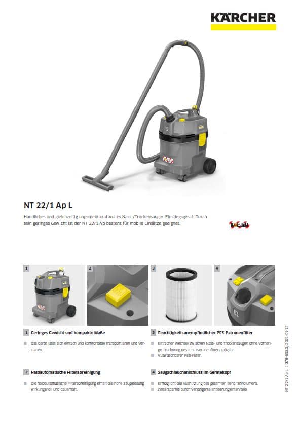 Klein, leistungsstark, zuverlässig, extrem vielseitig und federleicht: So überzeugt unser Nass-/Trockensauger NT 22/1 Ap bei leichten bis mittelschweren Reinigungsarbeiten in vielen gewerblichen Anwendungsbereichen. Staub, Grobschmutz und Flüssigkeiten meistert er dank halbautomatischer Filterabreinigung und feuchtigkeitsunempfindlichem PES-Patronenfilter mühelos. Der direkt im Gerätekopf angebrachte Saugschlauchanschluss ermöglicht dabei eine maximale Ausnutzung des Behältervolumens. Seine sehr kompakten Abmessungen und das geringe Gewicht erlauben einen komfortablen und problemlosen Transport des obendrein sehr einfach zu bedienenden Geräts.