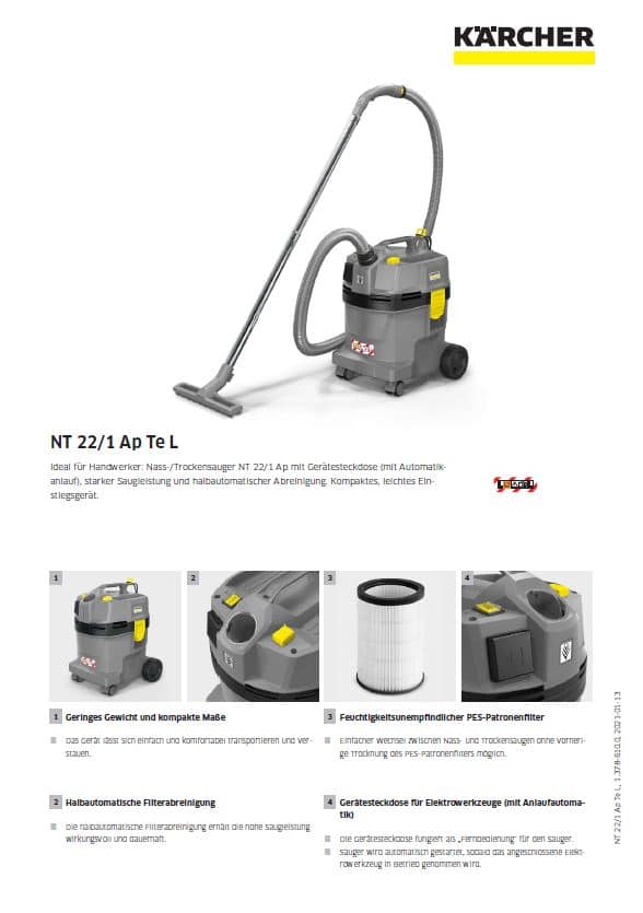 Handwerker werden diesen kleinen Kraftprotz sehr zu schätzen wissen. Unser Nass-/Trockensauger NT 22/1 Ap Te verfügt über eine Gerätesteckdose mit Automatikanlauf für Elektrowerkzeuge, ist sehr leicht und damit jederzeit bequem zu transportieren und überzeugt darüber hinaus mit starker Saugleistung bei leichten bis mittelschweren Reinigungsarbeiten. Ob Staub, grober Schmutz oder Flüssigkeiten: Dank halbautomatischer Filterabreinigung und des feuchtigkeitsunempfindlichem PES-Patronenfilter erledigt er zuverlässig und gründlich seine Arbeit. Dabei ermöglicht der in den Gerätekopf integrierte Saugschlauchanschluss die maximale Ausnutzung des Behältervolumens. Damit ist der einfach zu bedienende und vielseitige NT 22/1 Ap Te der ideale Begleiter bei Installations- und Renovierungsarbeiten, bei der Gebäudereinigung und vielen weiteren gewerblichen Anwendungen.
