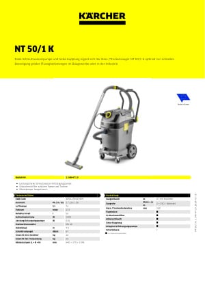 Ob auf Baustellen oder in Industriebetrieben: Der Nass-/Trockensauger NT 50/1 K von Kärcher ist speziell zur schnellen Beseitigung großer Wassermengen ausgelegt. Dank seiner leistungsstarken Entsorgungspumpe meistert er pro Minute über 330 Liter Schmutzwasser, inklusive des darin befindlichen Grobschmutzes bis zu Korngrößen von 20 Millimetern. Die serienmäßige Geka-Kupplung gewährleistet dabei seine Kompatibilität mit diesem weitverbreiteten Kupplungssystem für Wasserschläuche. Turbine und Entsorgungspumpe werden durch effektive Grobschmutzfilter vor angesaugten Kleinteilen, Steinen, Laub oder Resten von Baumaterial, vor Beschädigungen bzw. Verstopfung geschützt. Metall-Lenkrollen am robusten 50-Liter-Behälter und ein stufenlos einstellbarer Schubbügel sorgen für hohe Mobilität und einen mühelosen Transport des Saugers NT 50/1 K vom Fahrzeug zum Einsatzort und wieder zurück.