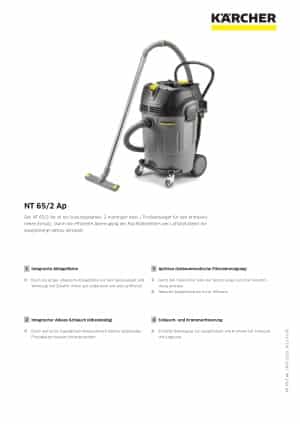 Beim NT 65/2 Ap handelt es sich um einen leistungsstarken Nass-/Trockensauger mit ApClean-System für eine konstant hohe Saugleistung und lange Arbeitsintervalle. Der Sauger verfügt über ein kompaktes Turbinengehäuse mit integriertem Filterdeckel zur leichten Entnahme des großen Flachfaltenfilters. Dieser wird mit Hilfe der semi-automatischen Filterabreinigung ApClean wirkungsvoll gereinigt. Dies sorgt für konstant hohe Saugleistung, längere Arbeitsintervalle und eine lange Lebensdauer des Filters. Der NT 65/2 Ap verfügt über eine elektronische Füllstandskontrolle beim Nasssaugen, welche ein Überschreiten der maximal zulässigen Füllmenge verhindert. Aufgesaugte Flüssigkeiten können über einen fest angebrachten, ölbeständigen Ablassschlauch problemlos entsorgt werden. Zubehör kann mit Hilfe des Clip-Systems einfach und schnell an den Sauger angeschlossen werden. Am Gerät befindet sich eine Schlauchaufbewahrung, eine Zubehörhalterung sowie eine große Ablagefläche, z. B. für Werkzeuge. Zwei große Bockräder und zwei Lenkrollen, geben dem NT 65/2 Ap die erforderliche Mobilität.