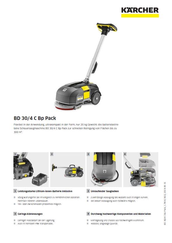 Batteriebetrieben und damit frei von Kabeln und dazugehörenden Stolperfallen, begeistert unsere extrem kompakte Scheuersaugmaschine BD 30/4 C Bp Pack auf Kleinflächen bis zu 300 m². Ob Natur- oder Kunststein, Epoxidharz, Linoleum oder PVC: Deutlich schneller und gründlicher als von Hand reinigt und saugt das Gerät bei Bedarf auch rückwärts und dank des umlaufenden Saugbalkens auch bei allen anderen Manövern zuverlässig. Das durchdachte und besonders einfache Bedienkonzept mit farbcodierten Bedienelementen zeigt sich auch beim simplen und schnellen Wechsel der leistungsfähigen und fix wieder aufladbaren Lithium-Ionen-Batterie. Das mit nur rund 20 Kilogramm geringe Gewicht der Maschine erlaubt deren Nutzung übrigens auch ohne Aufzug in unterschiedlichen Stockwerken.