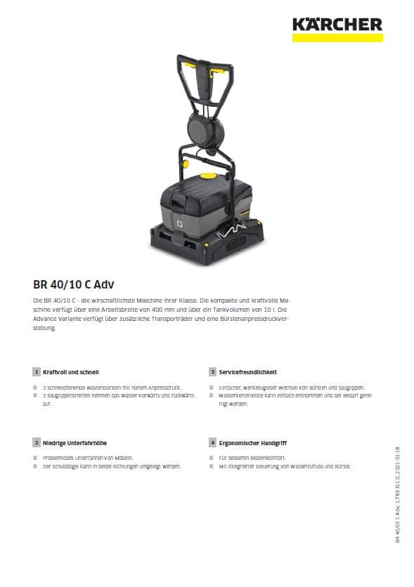 Die BR 40/10 C – die wirschaftlichste Maschine ihrer Klasse. Die kompakte und kraftvolle Maschine verfügt über eine Arbeitsbreite von 400 mm und über ein Tankvolumen von 10 l. Die Advance Variante verfügt über zusätzliche Transporträder und eine Bürstenanpressdruckverstellung.