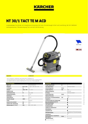 Auf Baustellen und in Werkstätten entstehen täglich gefährliche, teilweise lungengängige Feinstäube verschiedenster Art. Dank seiner sensorgesteuerten Filterabreinigung Tact beseitigt unser kompakter Nass-/Trockensauger NT 30/1 Tact Te M ACD bislang unerreicht hohe Mengen Feinstaub – bei gleichzeitig garantierter Filtrationseffizienz von 99,9 Prozent. Durch die Zertifizierung nach der neuen ACD-Norm (Appliance for the Pickup of Combustible Dust) gemäß IEC 60335-2-69:2021 ist das Gerät für das Aufsaugen brennbarer Stäube zugelassen. Die Saugleistung wird kontinuierlich sensorgesteuert überwacht und die Filterabreinigung bedarfsgerecht geregelt. Für die Direktabsaugung an Elektrowerkzeugen bietet es eine integrierte Gerätesteckdose mit Automatikanlauf sowie ein komplettes Antistatiksystem mit leitfähigem Zubehör. Bereits auf Boden oder Maschinen abgelagerte Stäube lassen sich mit dem sicher am Gerät verstauten Zubehör mühelos und vollständig in den robusten 30-Liter-Behälter mit Metalllenkrollen und Bumper aufsaugen.
