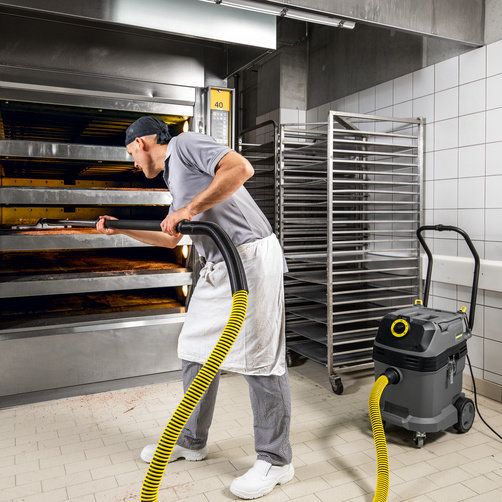 Dank unseres Bäckersaugers NT 40/1 Tact Bs können Bäcker und Konditoren aufatmen. Ob Fußböden, Maschinen oder sonstige Geräte – und mit optional erhältlichem Zubehör sogar der Backofen: Der Sauger meistert mühelos alle Herausforderungen, die ihn in der Backstube erwarten. Durch seine stabilen Verschlusslaschen aus Metall ist er als explosionsfestes Gerät zertifiziert und damit auch zum Saugen potenziell gefährlicher Mehlstäube geeignet. Die automatische Filterabreinigung Tact sorgt dabei nicht nur für eine konstant hohe Saugleistung, sondern ermöglicht auch das Saugen von großen Mengen feiner Stäube. Dazu ist der Sauger mit dem mittig angeordneten Drehschalter kinderleicht zu bedienen, hält durch den robusten Behälter auch härtere Einsätze schadlos aus und ist dank des serienmäßigen, ergonomischen Schubbügels besonders einfach zu transportieren.