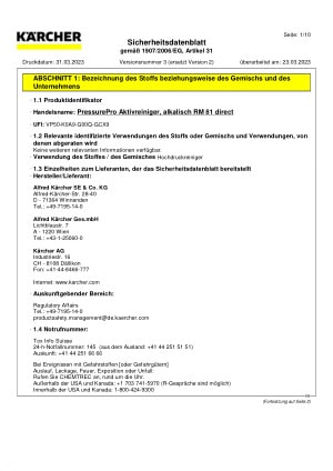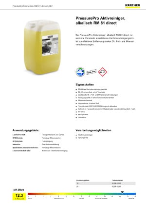Der PressurePro Aktivreiniger, alkalisch RM 81 direct, ist ein ohne Voransatz einsetzbares Hochdruckreinigungsmittel zur effektiven Entfernung starker Öl-, Fett- und Mineralverschmutzungen.