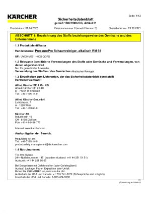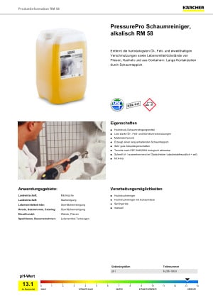 Der zur Entfernung von fett- und eiweißhaltigen Produktionsrückständen konzipierte, extra alkalische PressurePro Schaumreiniger RM 58 von Kärcher ist ideal für Reinigungseinsätze in der Fleisch-, Fisch- und Feinkostindustrie geeignet. Das hochaktive, schäumende und hygienische Reinigungskonzentrat zur Verwendung mit Hochdruckreinigern bildet einen stabilen Schaumteppich, der auch sehr gut an vertikalen Flächen haftet, eine intensive Reinigungswirkung entfaltet und gleichzeitig gut abzuspülen ist. Es entfernt außerdem mühelos typische Verschmutzungen der Lebensmittelindustrie wie von Mehl, Gluten, Grieß, Wein, Saft oder Bier. Kärcher bietet mit den PressurePro RM 57, RM 58 und RM 59 eine Reihe an Schaumreinigern für Hochdruckanwendungen in der lebensmittelverarbeitenden Industrie, Küchen in Gastronomie, Catering, Kantinen, Großküchen, Metzgereien, Schlachtereien und Bäckereien, die über eine HACCP-Konformitäts-Bestätigung des Instituts Fresenius verfügen. Je nach Bedarf und Einsatzzweck sind sie zur Reinigung von Oberflächen, Wänden, Böden, Transportbändern, Maschinen, Geräten, Kisten, Lebensmitteltanks und Fässern sowie Kühlräumen geeignet.