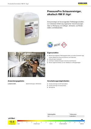 Durch eine spezielle Rezeptur mit schaumverstärkenden Eigenschaften ist der alkalische PressurePro Schaumreiniger RM 91 Agri die perfekte Lösung zur gründlichen Reinigung von Schweine-, Rinder- und Geflügelställen sowie Melkständen. Die einzigartigen Hafteigenschaften des Schaums ermöglichen auch an vertikalen Oberflächen besonders lange Kontakt- und Einwirkzeiten und damit noch bessere Reinigungsergebnisse. Organische Verschmutzungen wie Futterreste und tierische Ausscheidungen sowie anderer Schmutz werden vollständig und für Stalleinrichtung und Oberflächen schonend beseitigt. Bei besonders hartnäckigen Anhaftungen empfiehlt Kärcher vorab die Verwendung des PressurePro Einweichmittels RM 92 Agri.
