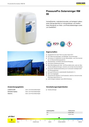 Extrem niedrig dosierbar (ab 0,125 %), kostengünstig, reinigungsstark und ideal in der Kombination mit dem Kärcher iSolar-System: Der PressurePro Solarreiniger RM 99 weiß bei der rückstandslosen und streifenfreien Reinigung aller Solar- und Photovoltaikanlagen sowie von Glasflächen zu überzeugen. Hocheffizient, materialschonend und biologisch abbaubar entfernt der für alle Wasserhärten geeignete Reiniger auch hartnäckigen Vogelkot, Pollen, Ruß und Stäube sicher und zuverlässig. Die innovative und sehr materialschonende, auch für Aluminiumrahmen geeignete Formulierung des PressurePro Solarreinigers RM 99 bildet dazu einen gleichmäßigen, geschlossenen Film auf der Oberfläche, der die Bildung von Kalkflecken verhindert und die Gleiteigenschaften der Reinigungsbürsten verbessert – für eine schonende Reinigung der Oberfläche, ganz ohne Nachspülen.